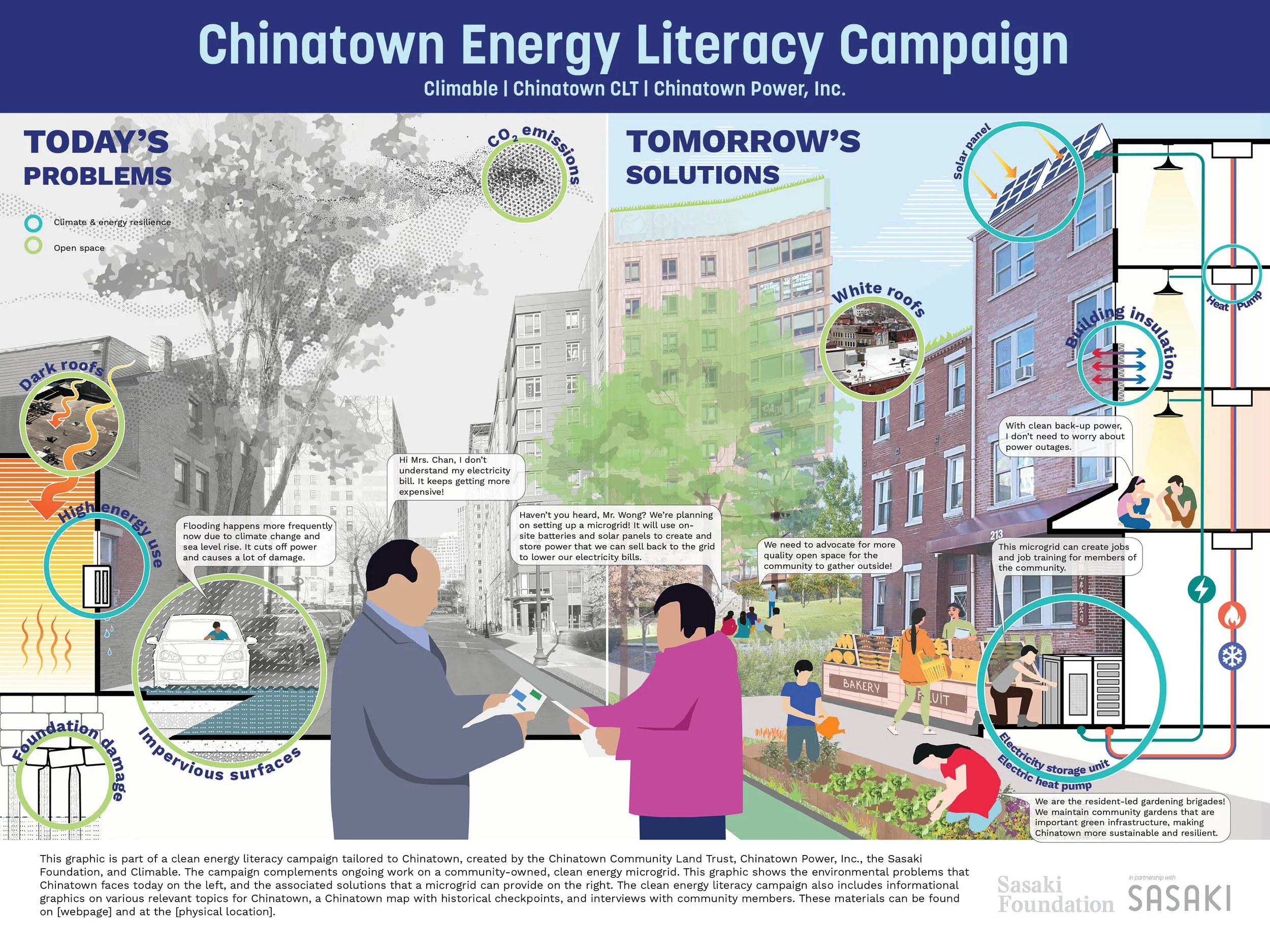 Climable and our Chinatown community partners, the Chinatown Community Land Trust and Chinatown Power, joined forces with the Sasaki Foundation to design an energy literacy campaign tailored to Bostonβs Chinatown. This project complements ongoing work around energy democracy, climate resilience, heat mitigation, and open space in Chinatown. It primarily supports the development of a clean energy community microgrid in Chinatown by providing necessary background information and vocabulary related to environmental justice issues in the community, as well as contextualizing the need for and benefits of a community microgrid. The project aims to empower residents to provide input on the design of the microgrid and to get involved in advocacy work for environmental justice.