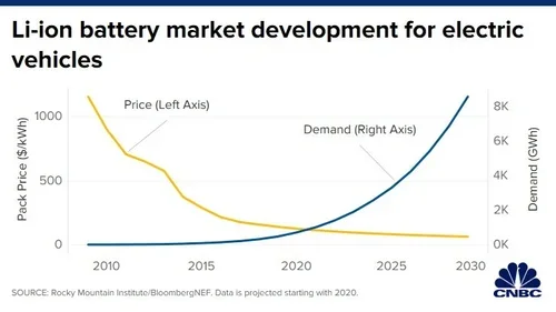 The price of lithium-ion batteries will decrease dramatically by 2030 as demand continues to soar. Image source: CNBC