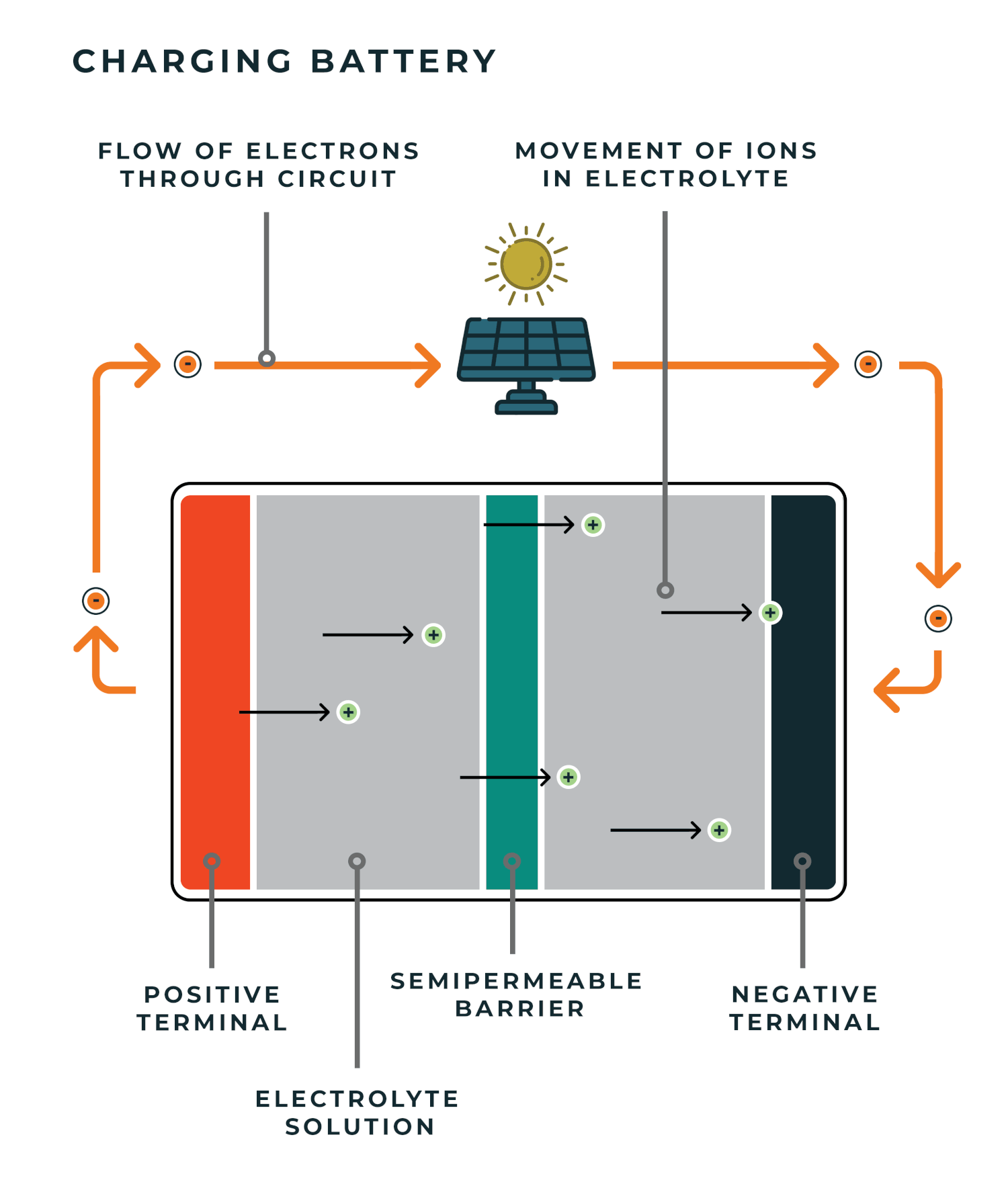 The battery is connected to an external circuit, which is the transmission line that gives energy to the electrochemical cell through electrons. Both an electrochemical cell and an electric circuit are required to store and release energy in a battery. Electrons move through the circuit and ions move through the electrolyte. As the electrons move from the cathode to the anode, the chemical potential energy of the electrolyte increases, which charges the battery. If the electrons move in the opposite direction, from the anode to the cathode, this energy is converted into electricity in the circuit and the battery runs. When the battery is fully charged, the circuit can disconnect and the battery is ready to be used at a later time.