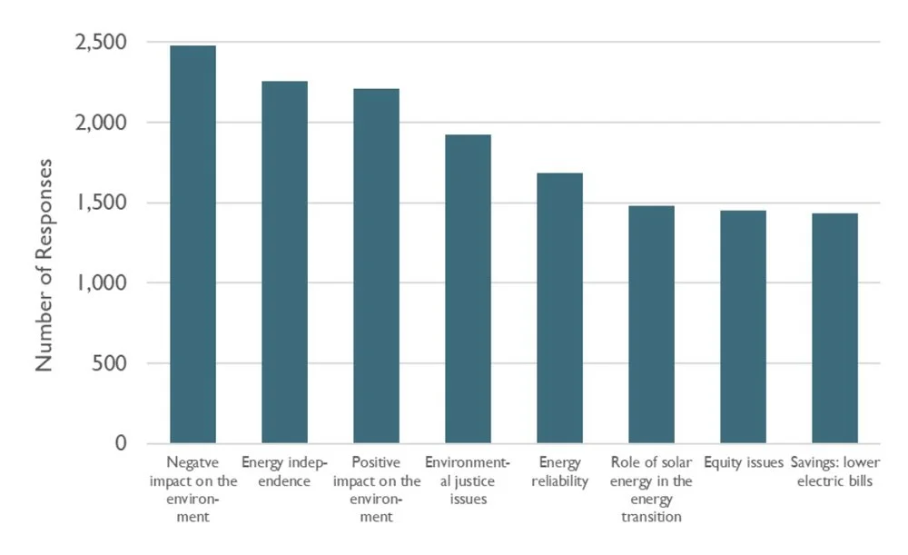 The survey also asked respondents to identify other topics important to them concerning the development of solar projects. They could select any number of pre-written responses, including: negative impact on the environment, energy independence, positive impact on the environment, environmental justice issues, energy reliability, and more. You can see the results of this question in the graph below.