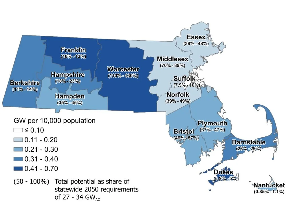 This map shows the percentage of solar power each county of MA could potentially contribute to meet the 2050 solar production goal based on this study’s results. Source: Synapse Energy Economics, 2023, p. 36.