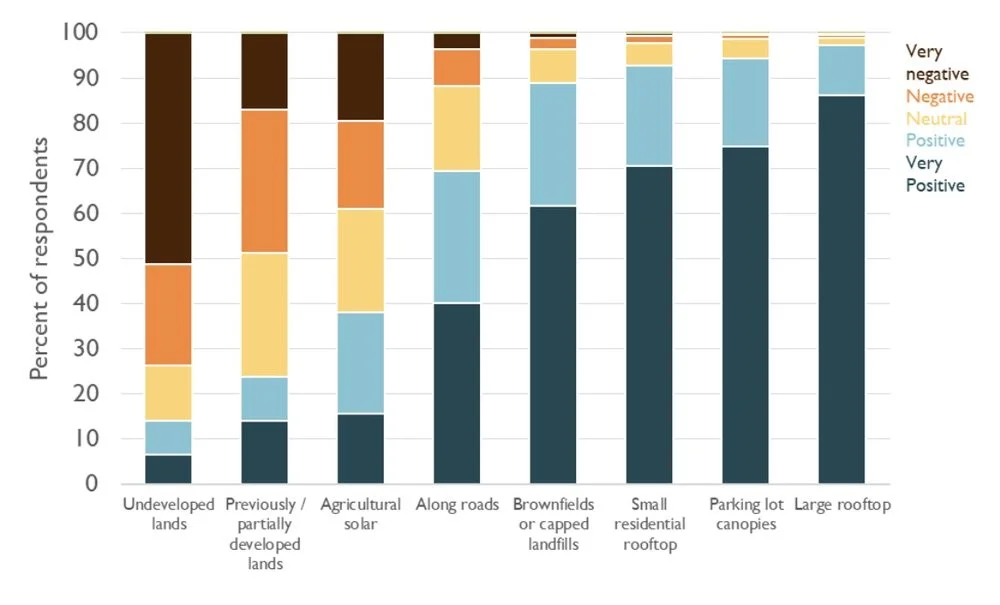 This graph shows respondents’ attitudes towards developing solar projects on the different land and building types listed above. Respondents were asked to rate their attitude toward each building and land type.